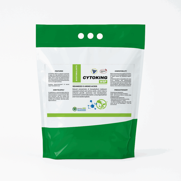 Cytoking WSP là chế phẩm dinh dưỡng sinh học dạng bột hòa tan (WSP – Water Soluble Powder), kết hợp sức mạnh của tảo nâu Ascophyllum nodosum và L-Amino axit, bổ sung hệ dinh dưỡng cân đối đa lượng phù hợp cho sự phát triển của cây trồng trong các giai đoạn sinh trưởng.